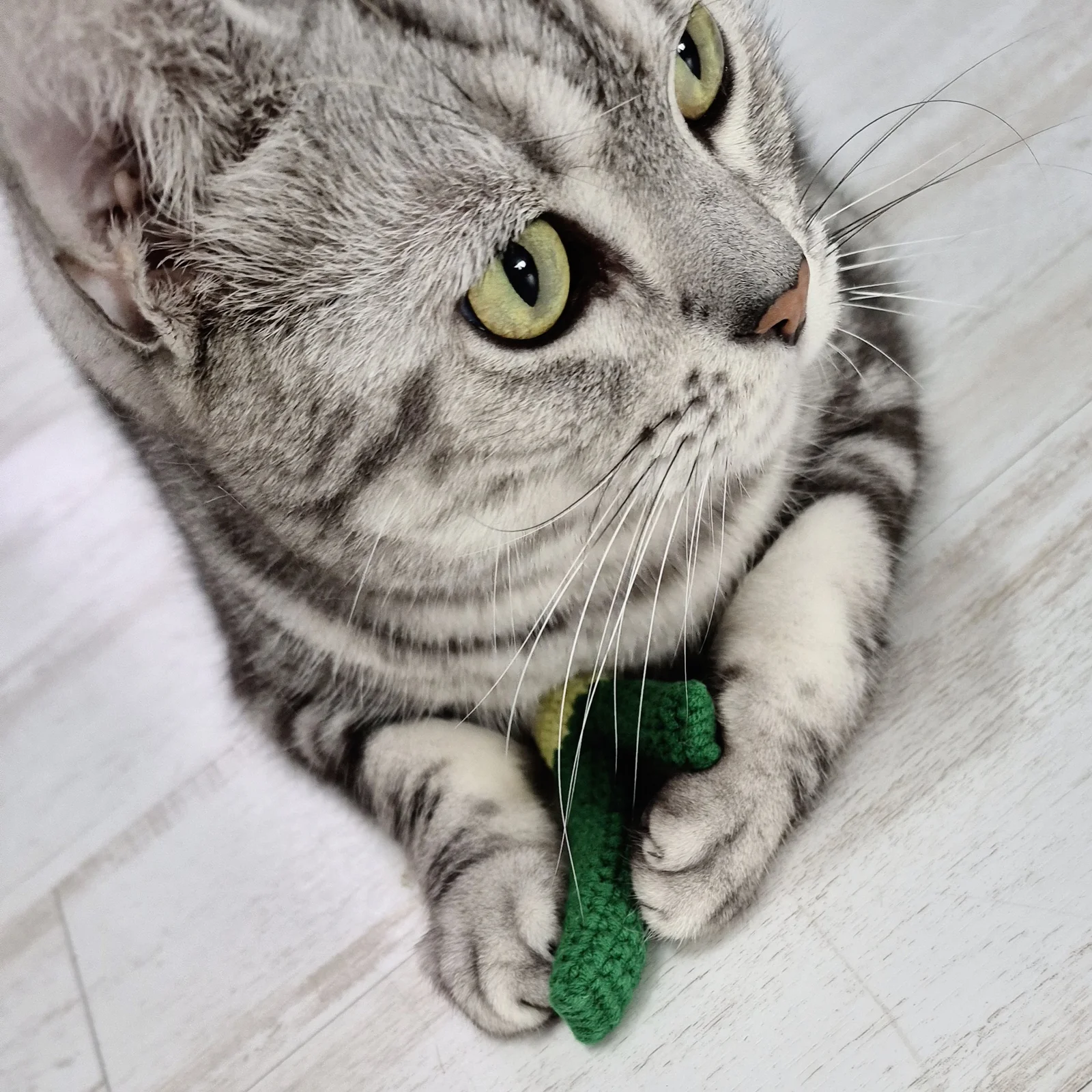 무더운 여름, 우리 집 회색 고양이가 새로운 장난감을 만나게 되었습니다. 하얀 무 몸통에 파릇파릇한 무청이 달린 뜨개질 장난감인데, 첫 만남부터 심상치 않더라고요. 초록빛 눈동자로...